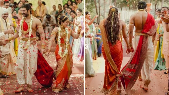 36 वर्षीय विजय ने आइवरी सिल्क धोती के साथ वर्मिलियन रंग का अंगवस्त्रम धारण किया, जिस पर मंदिर शैली की कढ़ाई की गई थी। उन्होंने लंबे गोल्ड नेकलेस, गोल्ड स्टड इयररिंग्स, कड़े और कमरबंध के साथ अपने लुक को पारंपरिक और राजसी अंदाज दिया। उनके हाथों और पैरों पर लगा आलता उनके पारंपरिक वेडिंग लुक को और भी खास बना रहा था।