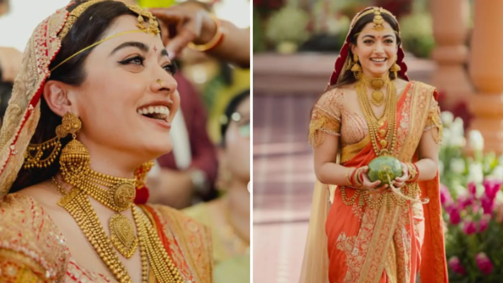 29 वर्षीय रश्मिका ने अपने खास दिन पर नारंगी और सुनहरे रंग की बनारसी सिल्क साड़ी पहनी, जिस पर सुनहरी जरी और पारंपरिक मोटिफ्स की बारीक कढ़ाई थी। उन्होंने इसे मैचिंग ऑरेंज सिल्क ब्लाउज के साथ पेयर किया, जिसमें स्कूप नेकलाइन और आधी आस्तीन पर सुनहरे बॉर्डर थे। साड़ी का हैवी गोल्ड पल्लू बेहद आकर्षक रहा, जिसे उन्होंने खूबसूरती से ओढ़ा। शुरुआत में उन्होंने सिर पर हल्का बेज दुपट्टा भी लिया।
